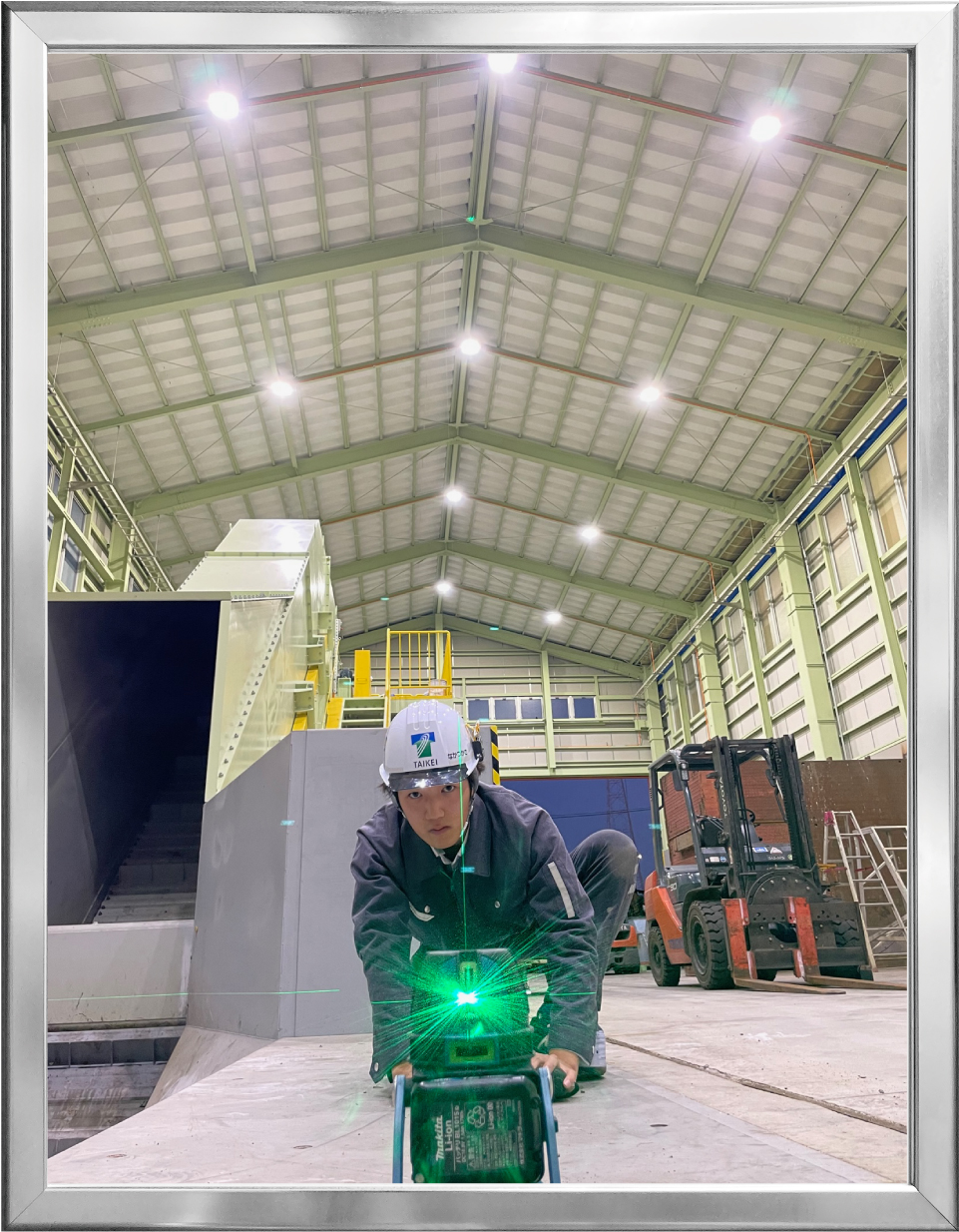改修工事エリアの建物内で、構造物を作るためにレーザー式墨出し器を使って位置出しを行っている様子です。すべての工程の基準となる、極めて重要かつ高い精度が求められる作業に、真剣な眼差しで集中する姿がとてもスマートで印象的でした。建設業の魅力である「何もないところから形をつくり上げていく」その始まりの瞬間を切り取った一枚になっています。
