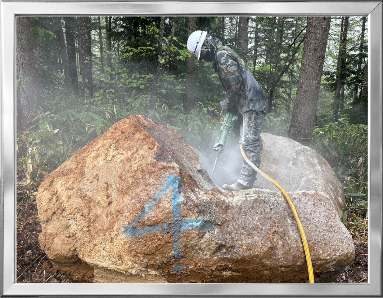 転石破砕(仮設道を作設中に転石が出てしまい運搬するために小割りにしている状況です。) |