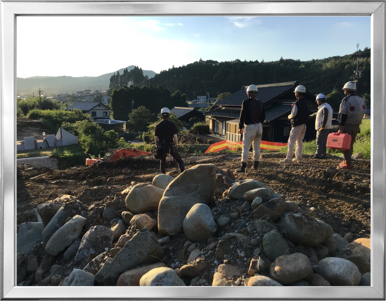 国道19号瑞浪恵那道路新設工事において、現場での打ち合わせ写真です。施工方法について、協力業者さんとで作業終了後に打ち合わせをしている際に、夕日に向かっている背中がかっこいいなと思い撮影しました。