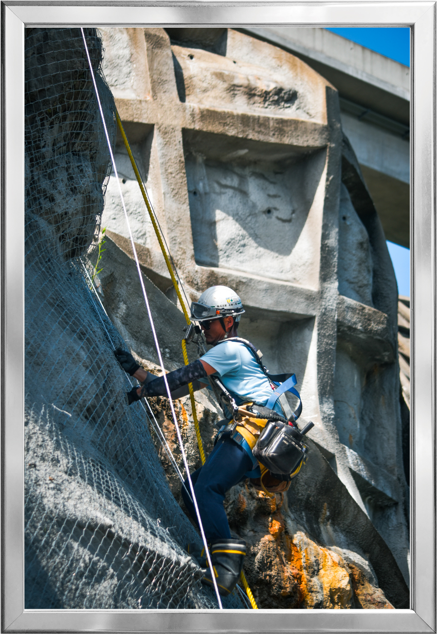 法面(斜面)の浸食防止や風化防止、落石予防のためにコンクリート吹付の下地として、ラス金網を設置しているところです。 |