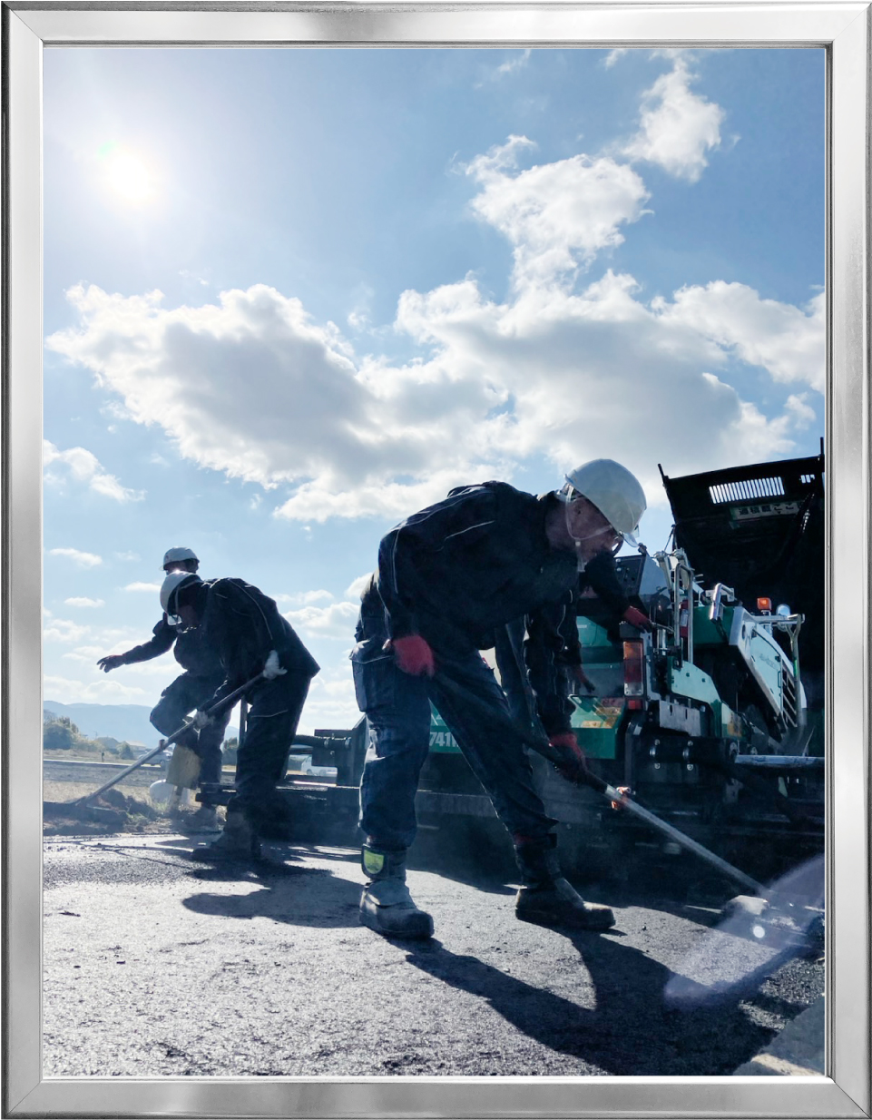 写真には道路工事で表面を丁寧にならしている作業の様子が写っています。