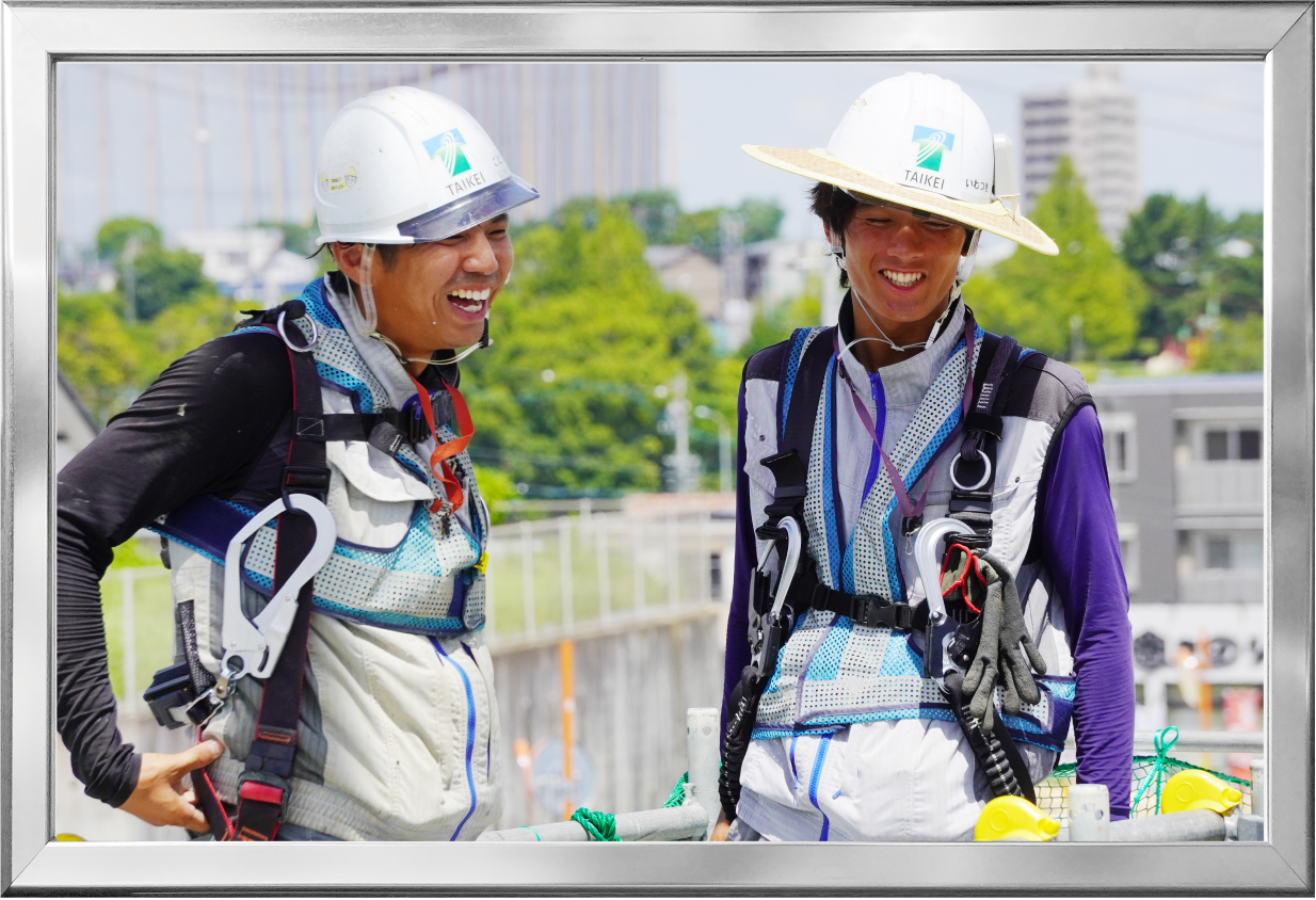 建設現場では、最新技術を駆使し、現場の作業効率を大幅に向上させる人、従来からの手作業により現場を支える人、仲間と協力しながら作業に当たる人、若い技術者を指導するベテラン技術者など、大勢の人が一丸となって工事に取り組んでいます。