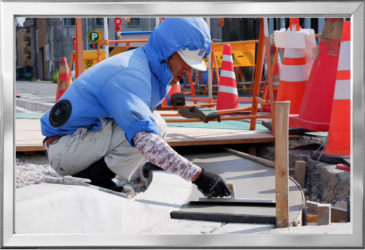 街渠エプロン(側溝へ雨水を流す傾斜した舗装面)の表面を仕上げているところ |